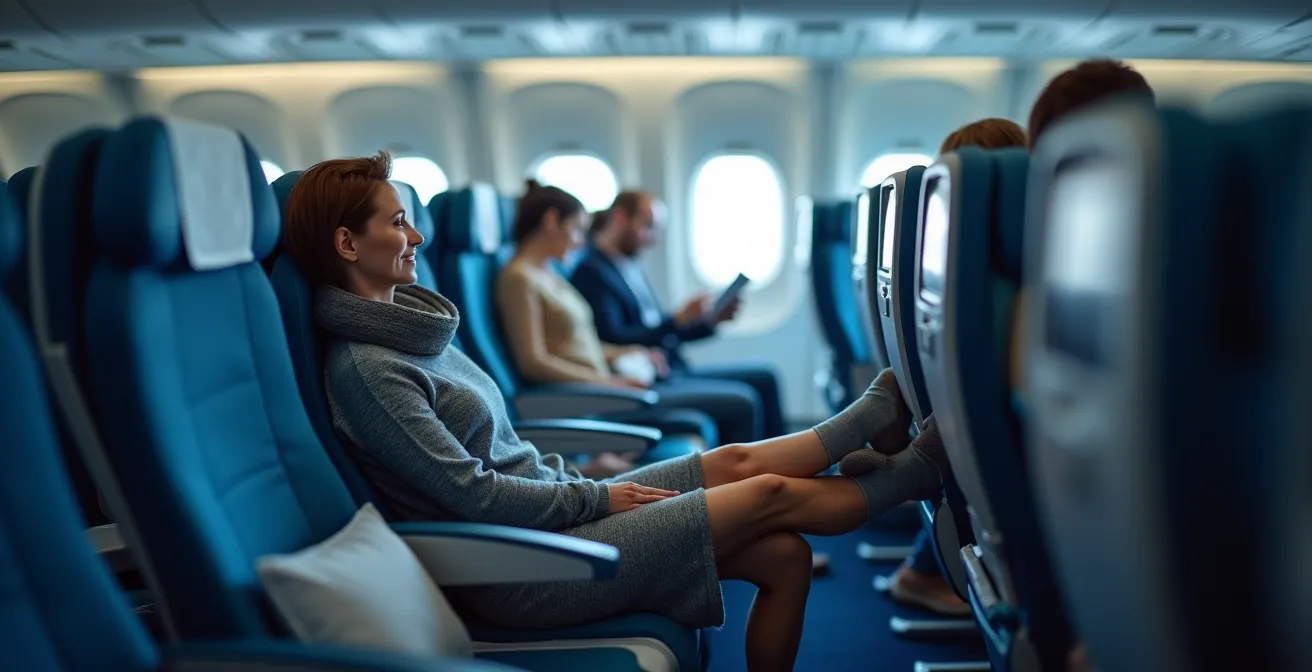 Commençons par l’élément le plus crucial et souvent le plus négligé de votre panoplie de voyageur : la compression veineuse. Beaucoup l’associent à un accessoire médical pour personnes âgées, une erreur fondamentale. Sur un vol long-courrier, c’est votre meilleure assurance vie contre les problèmes circulatoires. L’immobilité prolongée, combinée à la pression de la cabine, entraîne une stagnation du sang dans les veines des jambes, un phénomène appelé stase veineuse. Cela provoque non seulement la désagréable sensation de jambes lourdes et le gonflement des chevilles, mais augmente aussi drastiquement le risque de phlébite (ou thrombose veineuse). Selon les études, le risque de thrombose veineuse est 4 à 10 fois plus élevé sur les vols de plus de quatre heures.